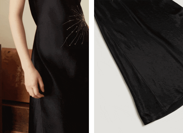 同时斜裁裙片又只做了一条拼接缝,加上我们这个醋酸面料的垂顺感好,出来的光泽度是很莹润天然的,这就让整条裙子正在视觉上有了种完整的流动感。