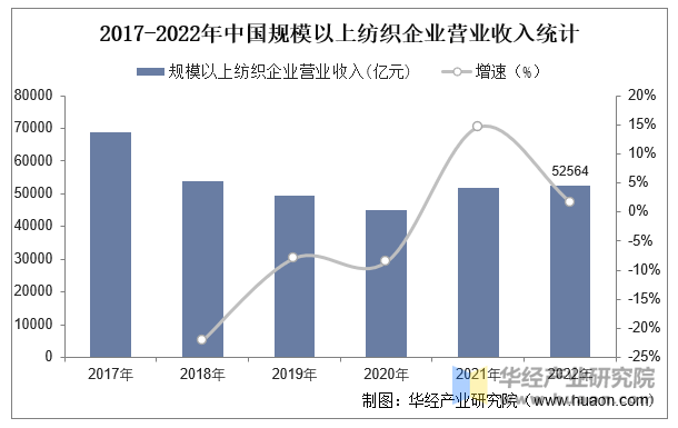 2017-2020年期间,中国规模以上纺织企业停业收入逐年下降,曲至2021年呈现回升现象。2022年,中国规模以上纺织企业停业收入52564亿元,同比增加0。9%。