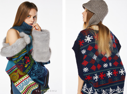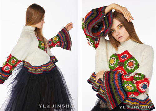 保守平易近族服饰往往布局宽松、包裹,这一特征被YL&JINSHU延展为秋冬针织服的焦点版型:如超大肩线大氅、下摆犯警则的钩编拼接等,通过“流动”代替“”,展示女性柔韧而无力的体态。