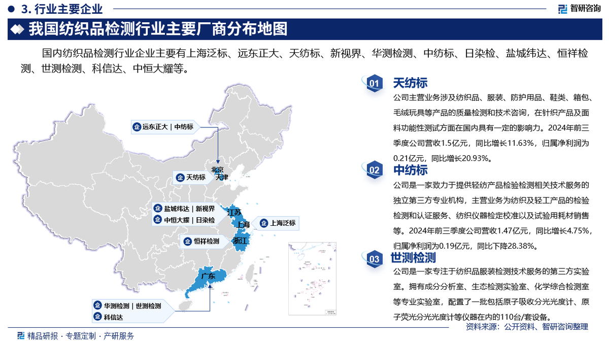 国内纺织品检测行业企业次要有上海泛标、远东正大、天纺标、新视界、华测检测、中纺标、日染检、盐城纬达、恒祥检测、世测检测、科信达、中恒大耀等。此中天纺标从停业务涉及纺织品、服拆、防护用品、鞋类、箱包、毛绒玩具等产物的质量检测和手艺征询,正在针织产物及面料功能性测试方面正在国内具有必然的影响力。2024年前三季度公司营收1。5亿元,同比增加11。63%,归属净利润为0。21亿元,同比增加20。93%。中纺标是一家努力于供给轻纺产物查验检测相关手艺办事的第三方专业机构,从停业务为纺织及轻工产物的查验检测和认证办事、纺织仪器检定校准以及试验用耗材发卖等。2024年前三季度公司营收1。47亿元,同比增加4。75%,归属净利润为0。19亿元,世测检测是一家专注于纺织品服拆检测手艺办事的第三方尝试室。具有成分阐发室、生态检测尝试室、化学分析检测室等专业尝试室,设置装备摆设了一批包罗原子接收分光光度计、原子荧光分光光度计等仪器正在内的110台/套设备。