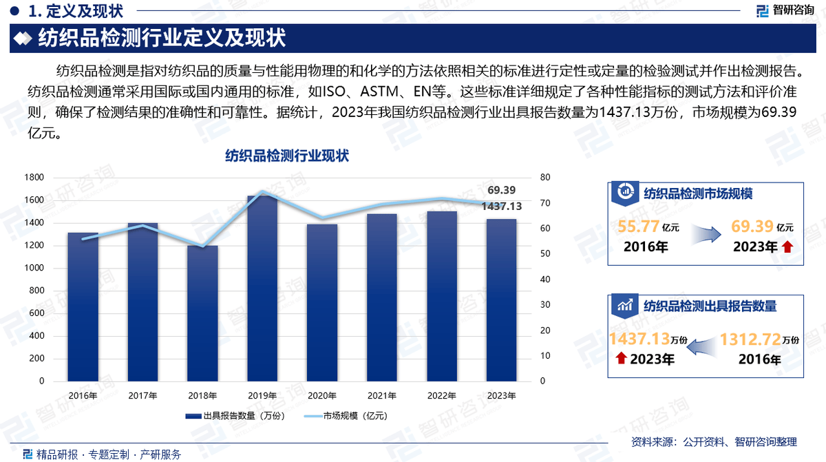 纺织品检测是指对纺织品的质量取机能用物理的和化学的方式依关的尺度进行定性或定量的查验测试并做出检测演讲。纺织品检测凡是采用国际或国内通用的尺度,如ISO、ASTM、EN等。这些尺度细致了各类机能目标的测试方式和评价原则,确保了检测成果的精确性和靠得住性。据统计,2023年我国纺织品检测行业出具演讲数量为1437。13万份,市场规模为69。39亿元。
