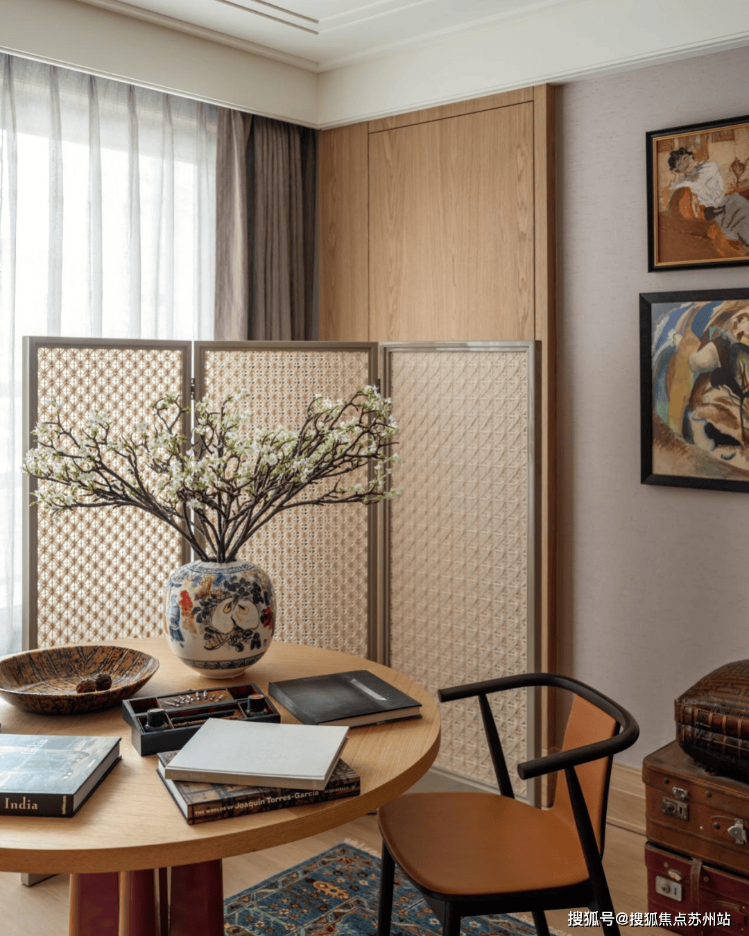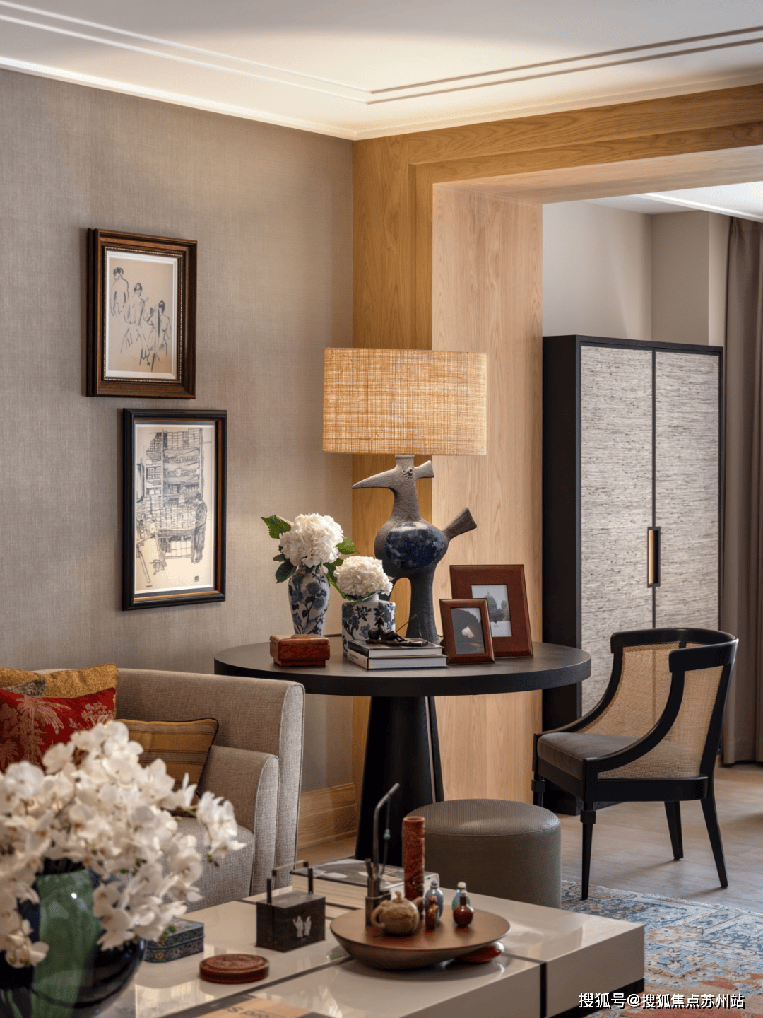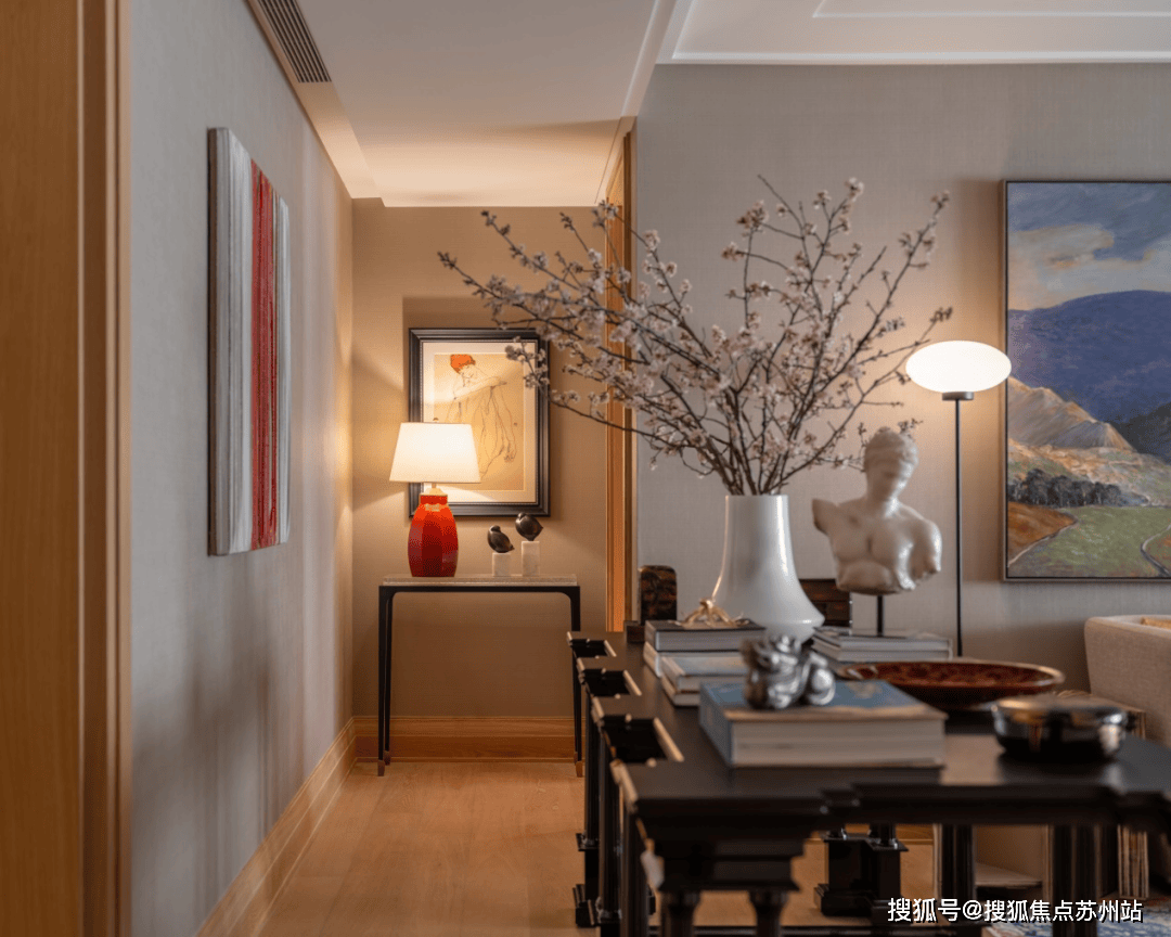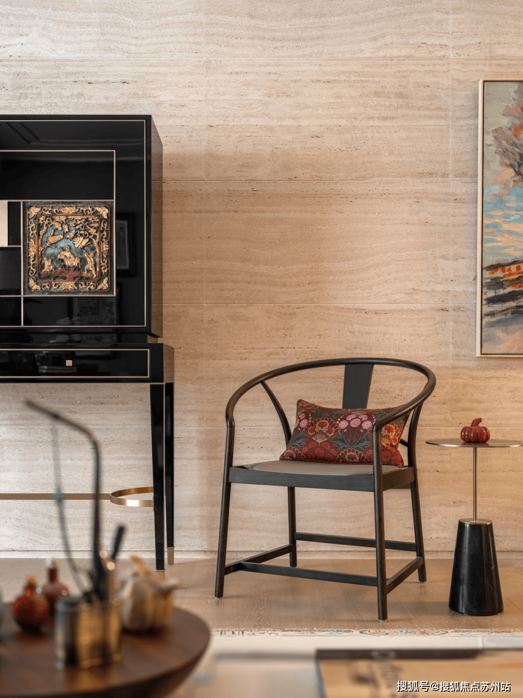 融合焕新的高柜摆放于洞石墙前,哑光取纹丰硕的米白洞石陪衬出了高光黑色烤漆的艰深取沉静。而嵌入柜面的中式挂屏无疑是点睛之笔,采用鎏金工艺对人物和图案进行着色,展示了保守取现代融合的可能性。