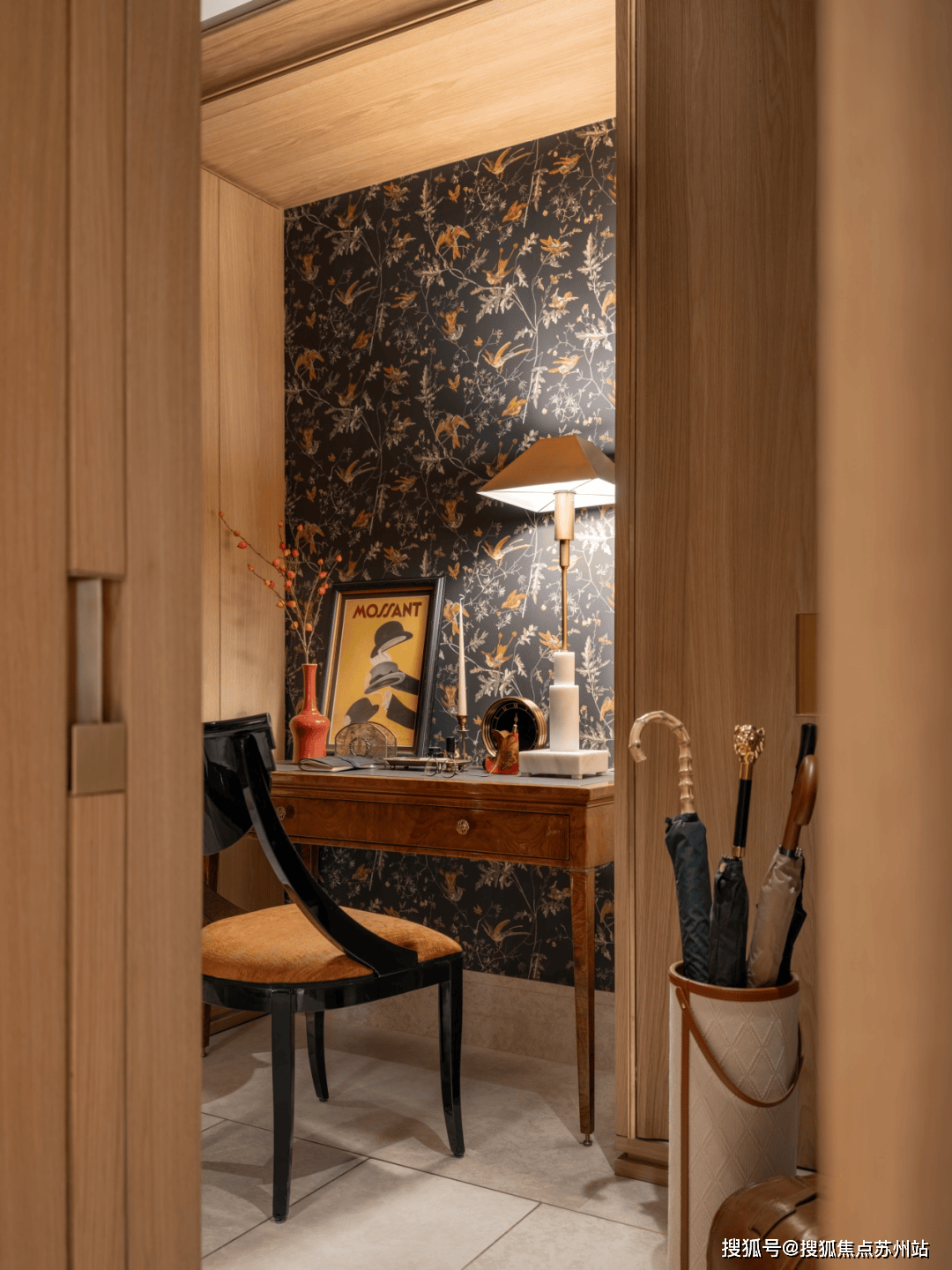 玄关具有变化性取功能多沉性,壁纸融合中色彩和纹样,除了功能,更摆放了古董书写桌,以手写文字传送消息,传送慢节拍糊口体例,丰硕空间的粉饰和功能,目光所及视角变得丰硕。